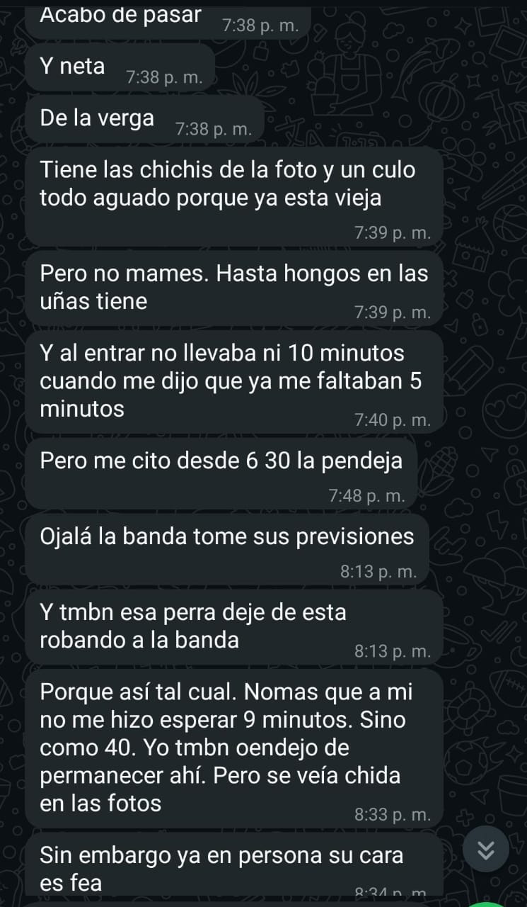 @joaquingal Terrible creo que la primera señal de advertencia de fraude es la foto, la chica se ve muy bien, pero el precio no cuadra, una que este realmente así cobra la media hora mínimo en $700, y la hora en $1300, más, cuando es muy barato hay mucho riesgo, sobre todo la verruga, lo sucio del lugar, espero no hayas pedido el oral al natural, es un escenario de pesadilla, el que describes.